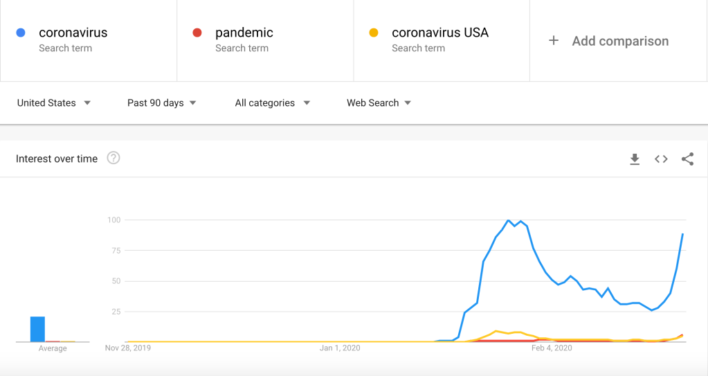 On February 27th, 2020, Dr. Tedros Adhanom Ghebreyesus, director-general of the WHO, stated in a press release that the virus has “pandemic potential” and that “the number of new cases reported in the rest of the world has exceeded the number of new cases in China”. Looking at the Google trends report, there is a noticeable increase in searches for the term ‘pandemic’ that occurs around the same time of this press release.