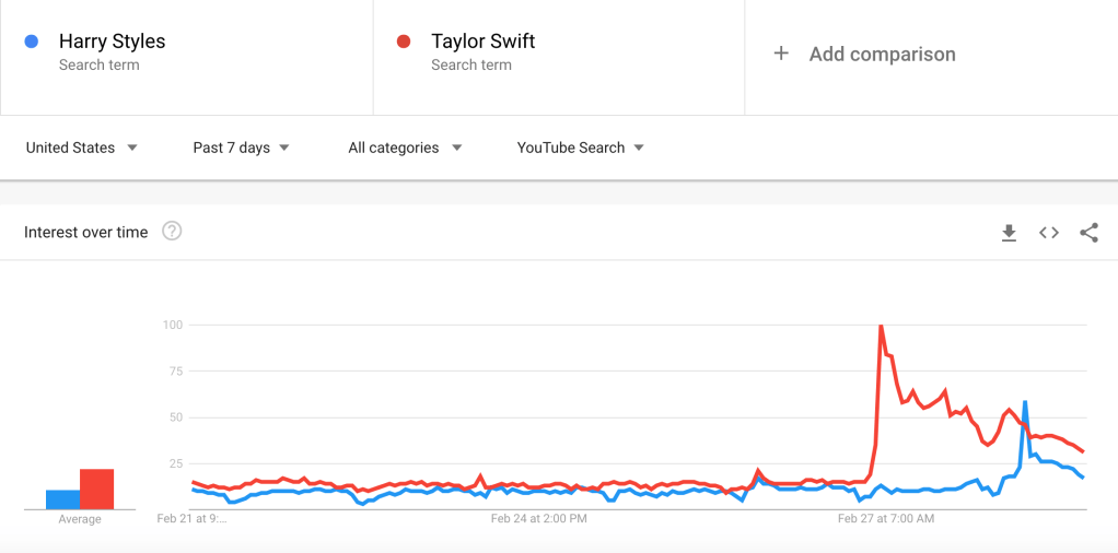 The following day Harry Styles, ex- One Direction member and current teen heartthrob, released a music video for his song “Falling”. After only 12 hours, the video sits at over 4 million views. The google trend report above illustrates the spike in searches for “Harry Styles” on YouTube.