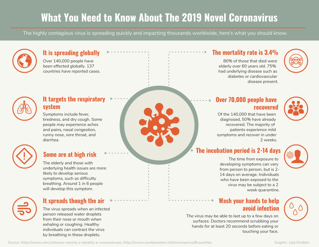 Of the 140,000 that have been diagnosed, over 70,000 have already recovered. The 3.4% mortality rate is mostly made up of elderly individuals, or people with compromised immune symptoms. Since the virus targets the respiratory system, those who have any sort of respiratory illness are highly encouraged to self isolate to protect themselves.